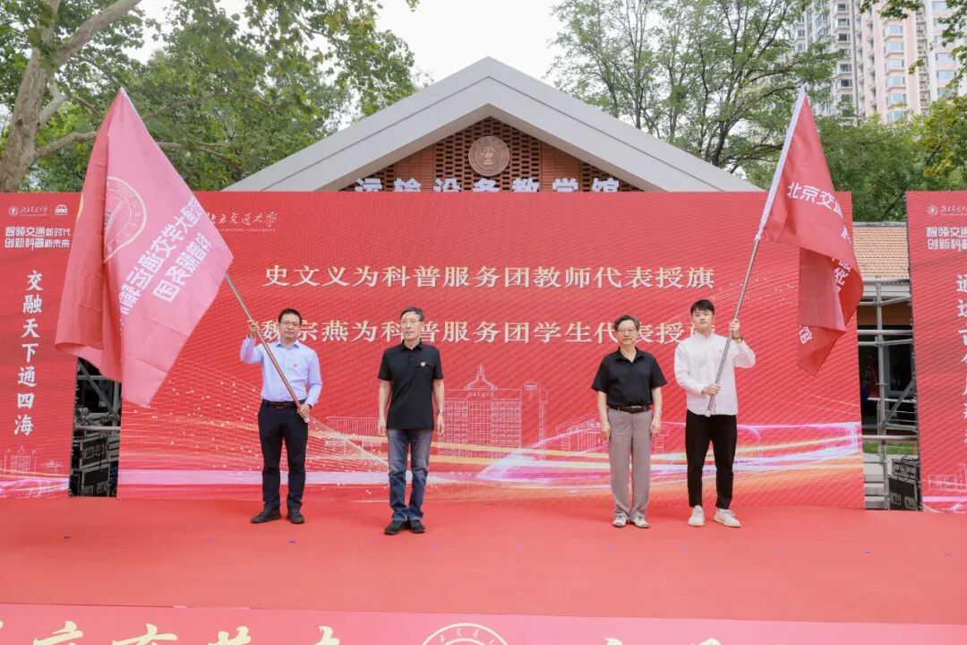 史文义为科普服务团教师代表授旗,魏宗燕为科普服务团学生代表授旗。