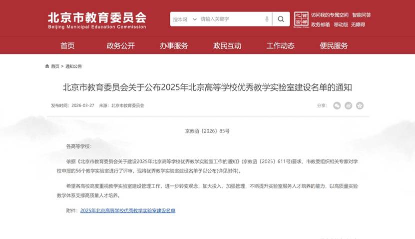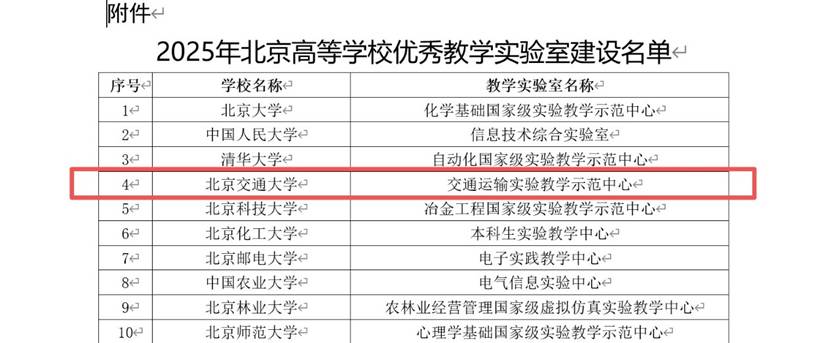 近日,北京市教育委员会公布2025年北京高等学校优秀教学实验室建设名单,澳彩开奖结果 交通运输实验教学示范中心成功入选。