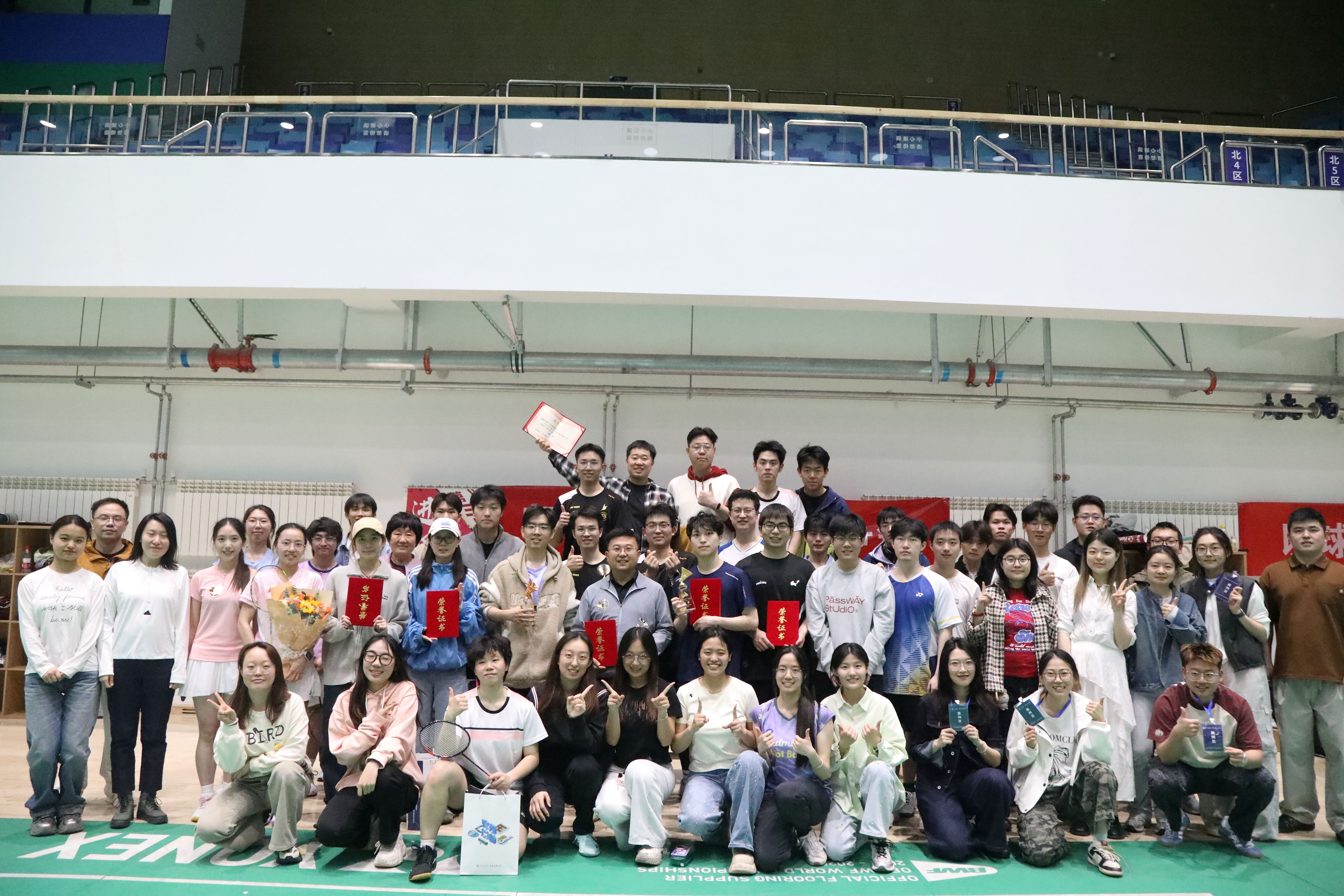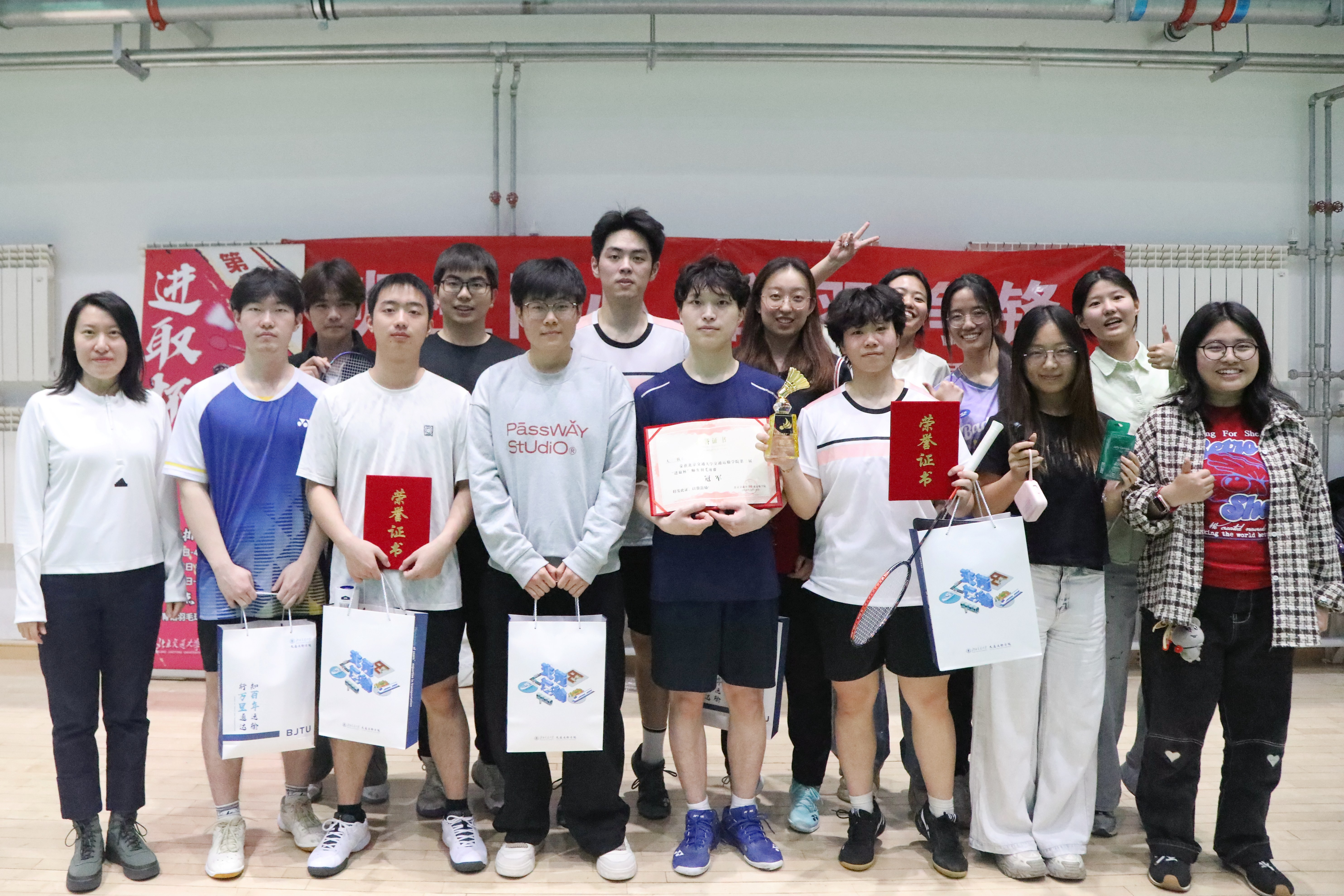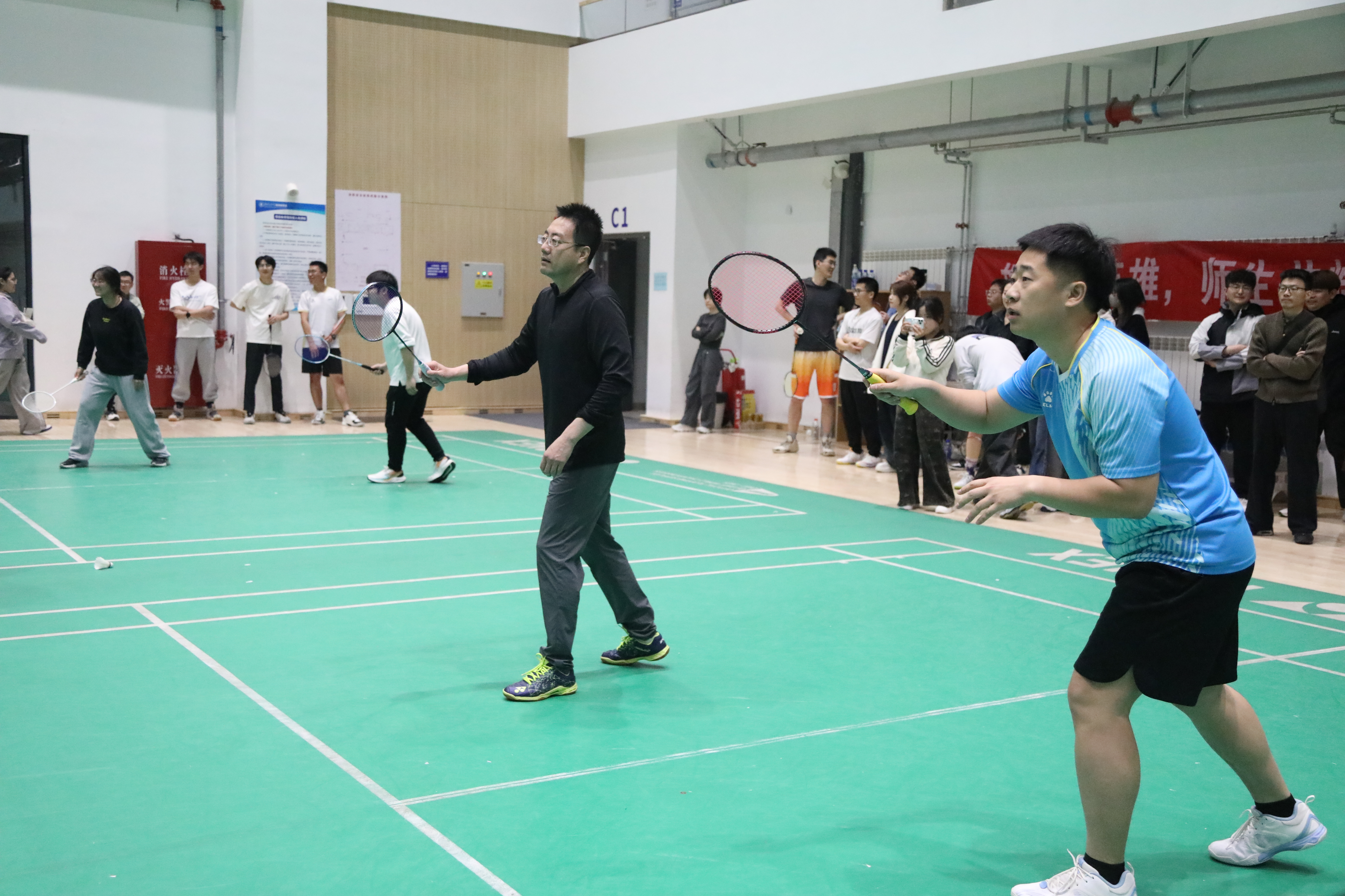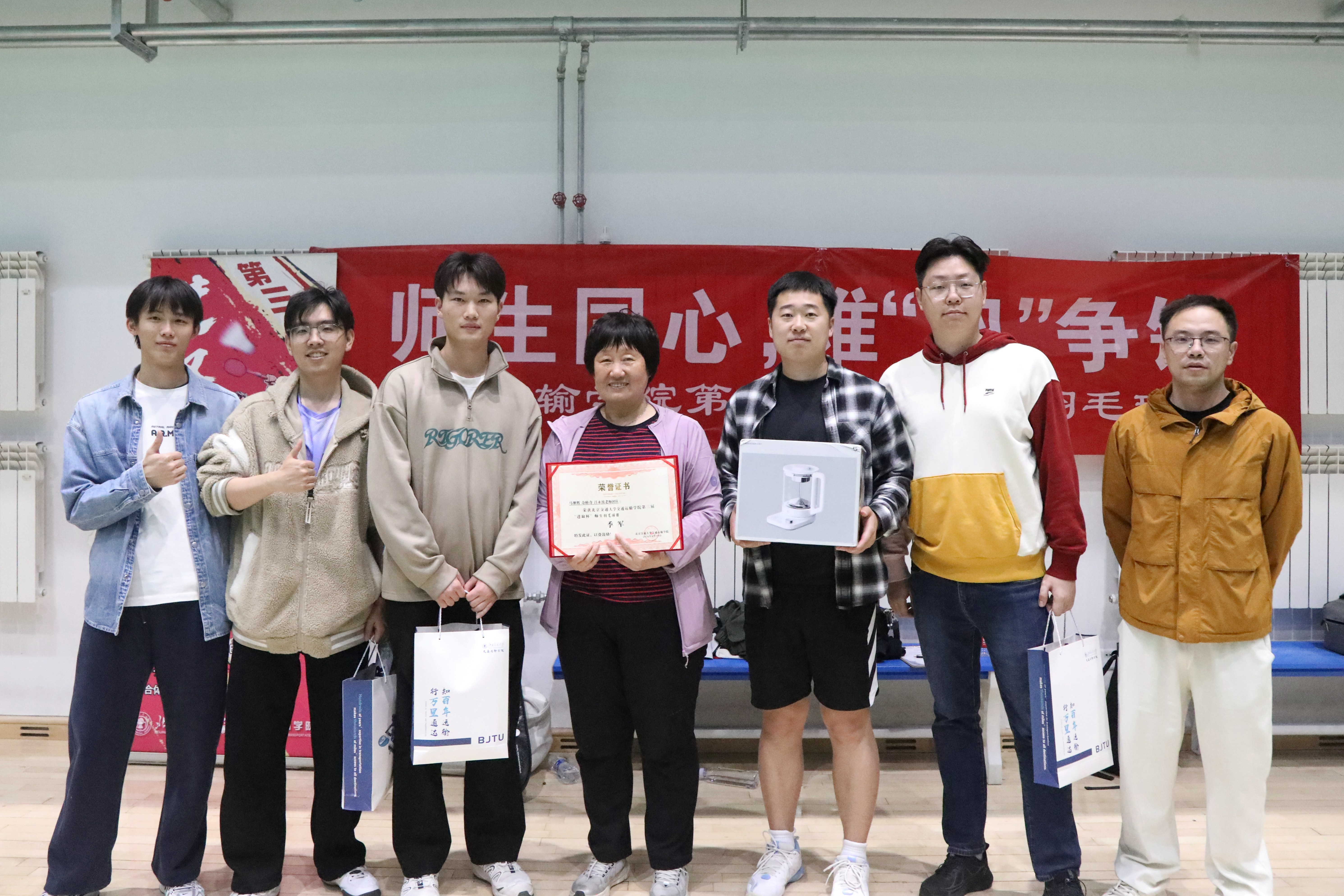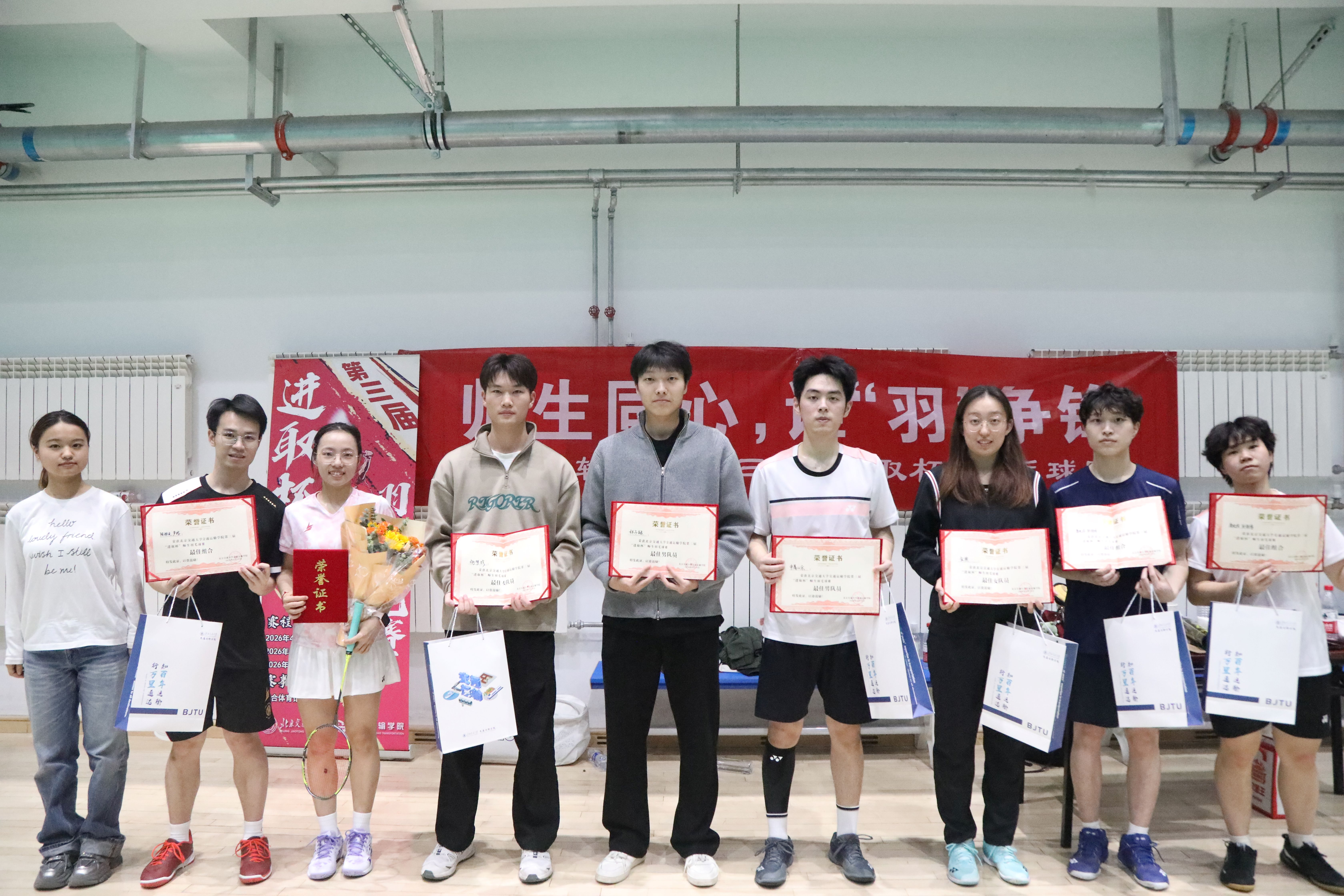 为迎接百卅校庆,弘扬拼搏精神,激发奋进活力。2026年4月19日,澳彩开奖结果 第三届“进取杯”师生羽毛球赛决赛暨颁奖仪式在综合体育馆羽毛球训练馆举行,为期10天的赛程落下帷幕。澳彩开奖结果 党委副书记、副院长陈军华,党委副书记于海妹,本研辅导员老师和参赛师生共同参加闭幕式。